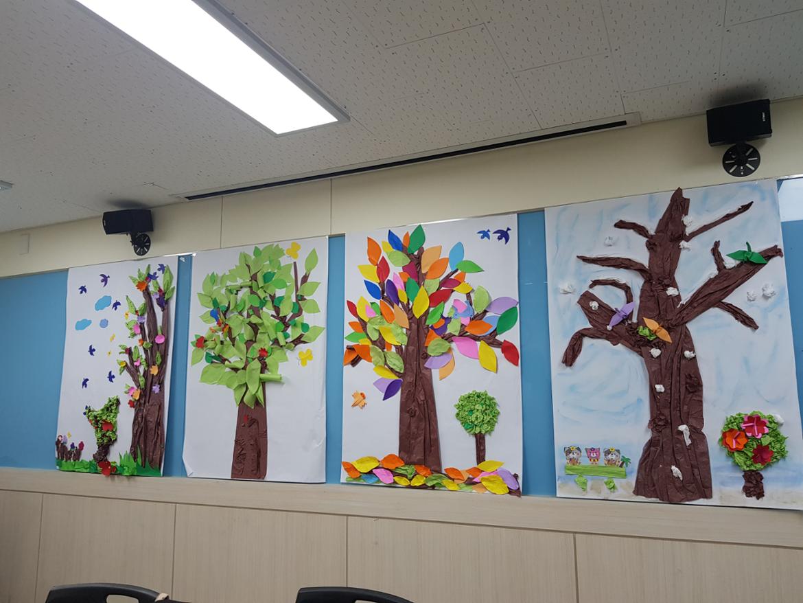 봄.여름,가을,겨울 나무의 변화를 한지 및 색종이로 표현한 작품