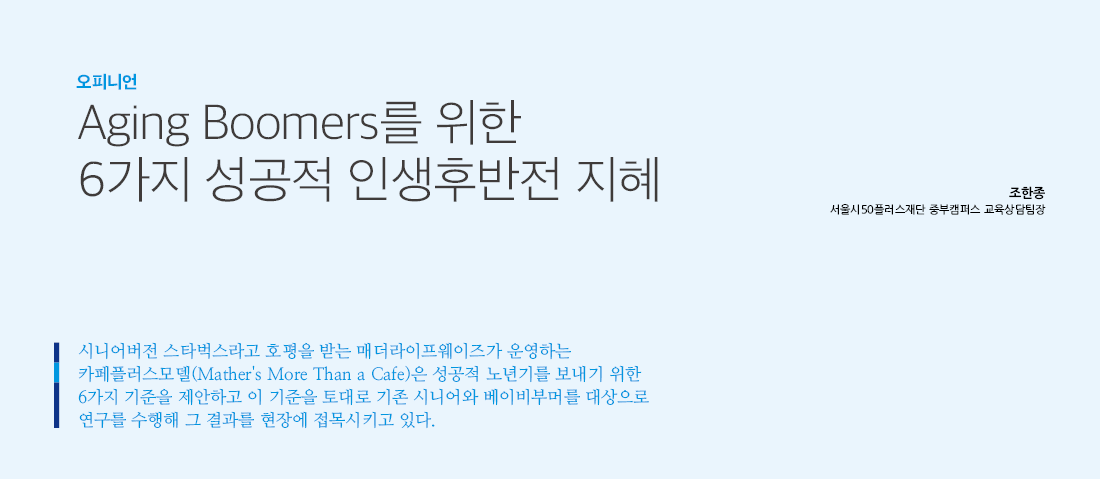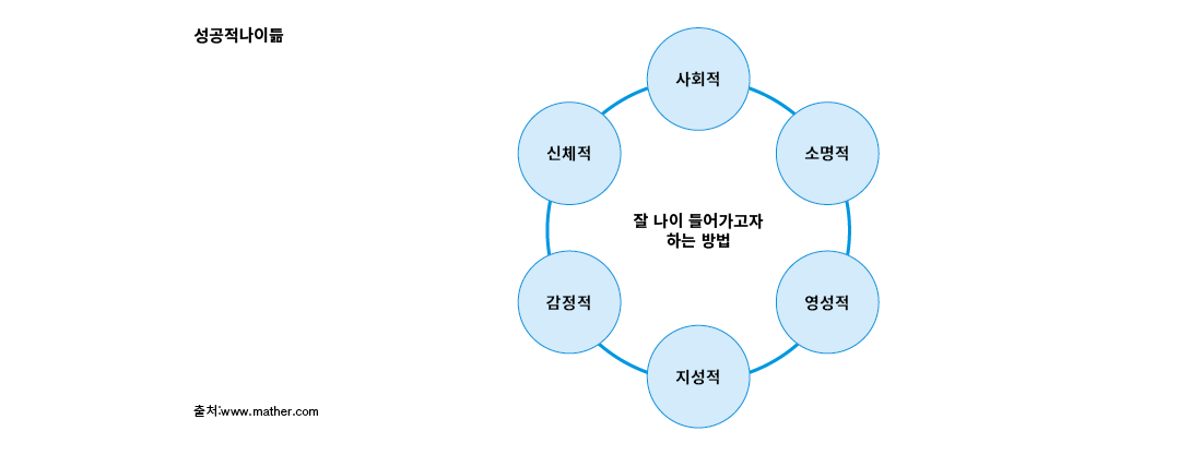 시니어를 대상으로 복합적 상품과 서비스를 제공하는 미국의 대표적 비영리민간기관인 매더라이프웨이즈는 성공적 노년기를 보내기 위해서 6가지를 제안한다.