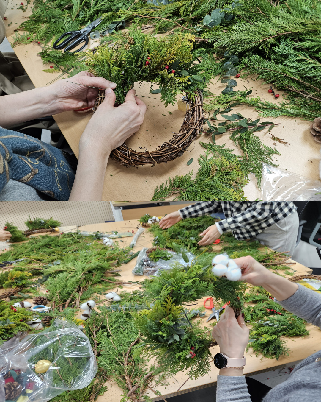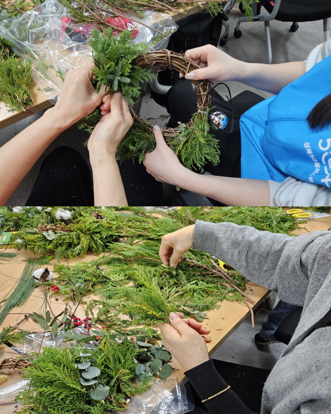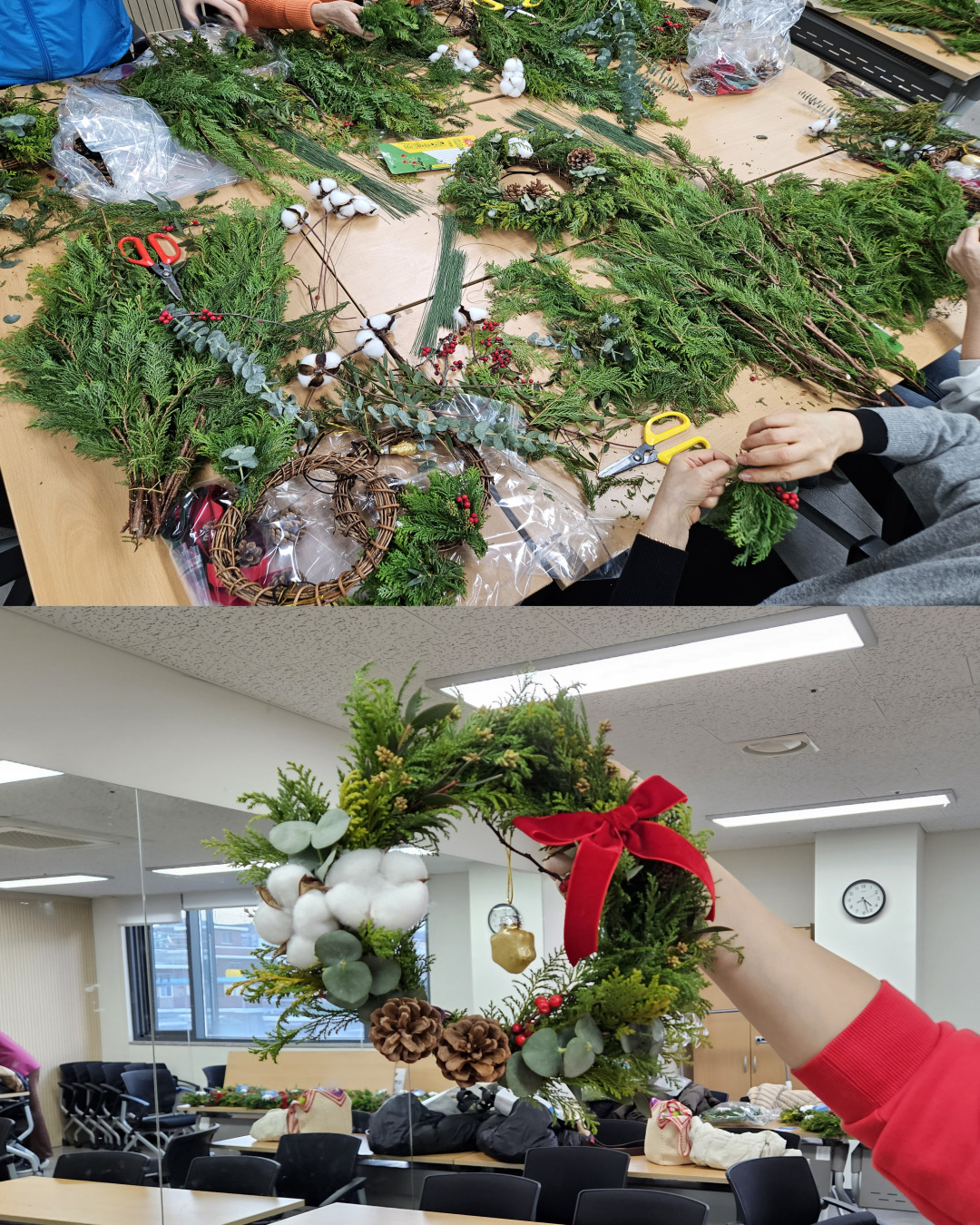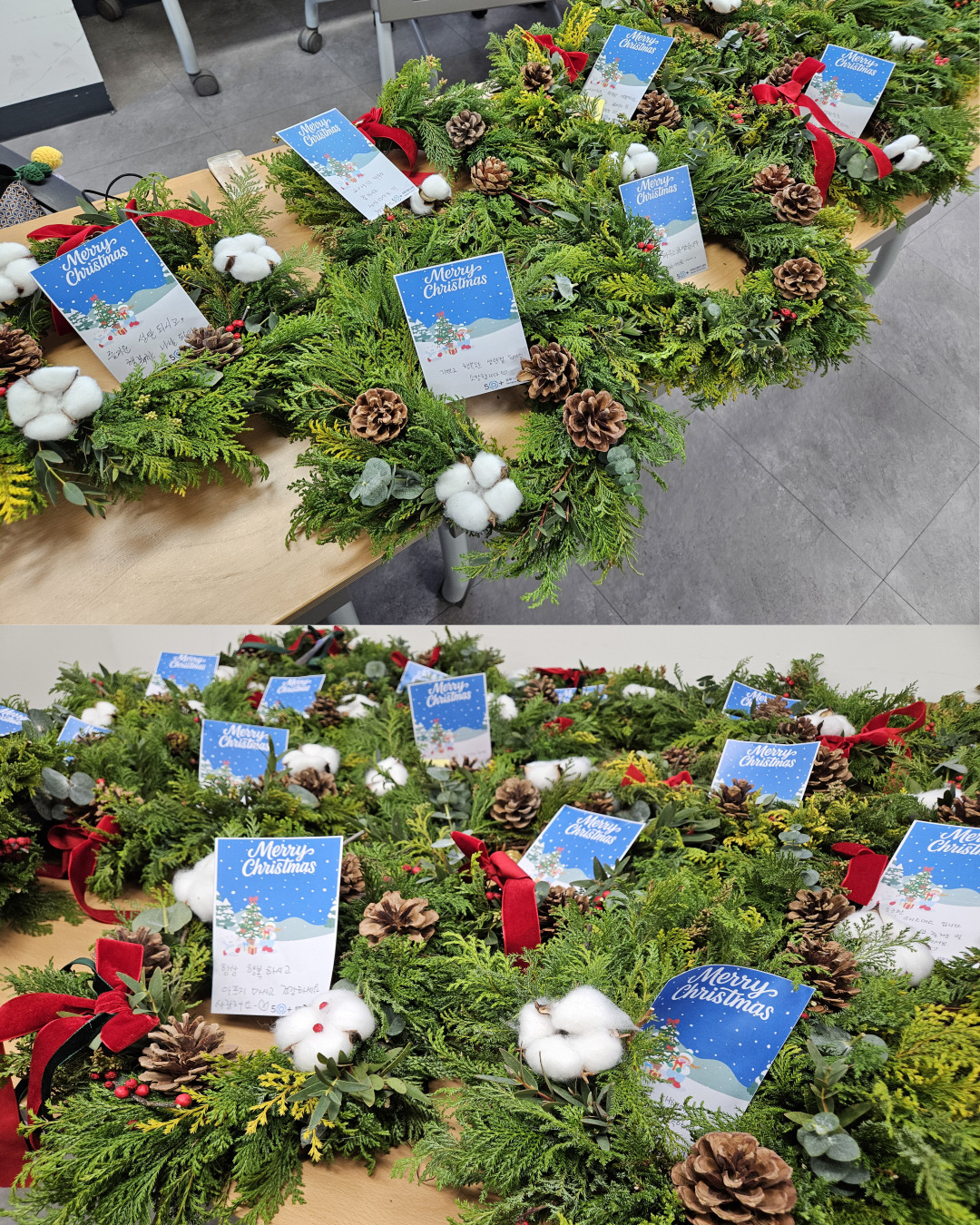 지역 소외계층에게 전달될 크리스마스 리스를 하나하나 정성껏 완성했습니다.