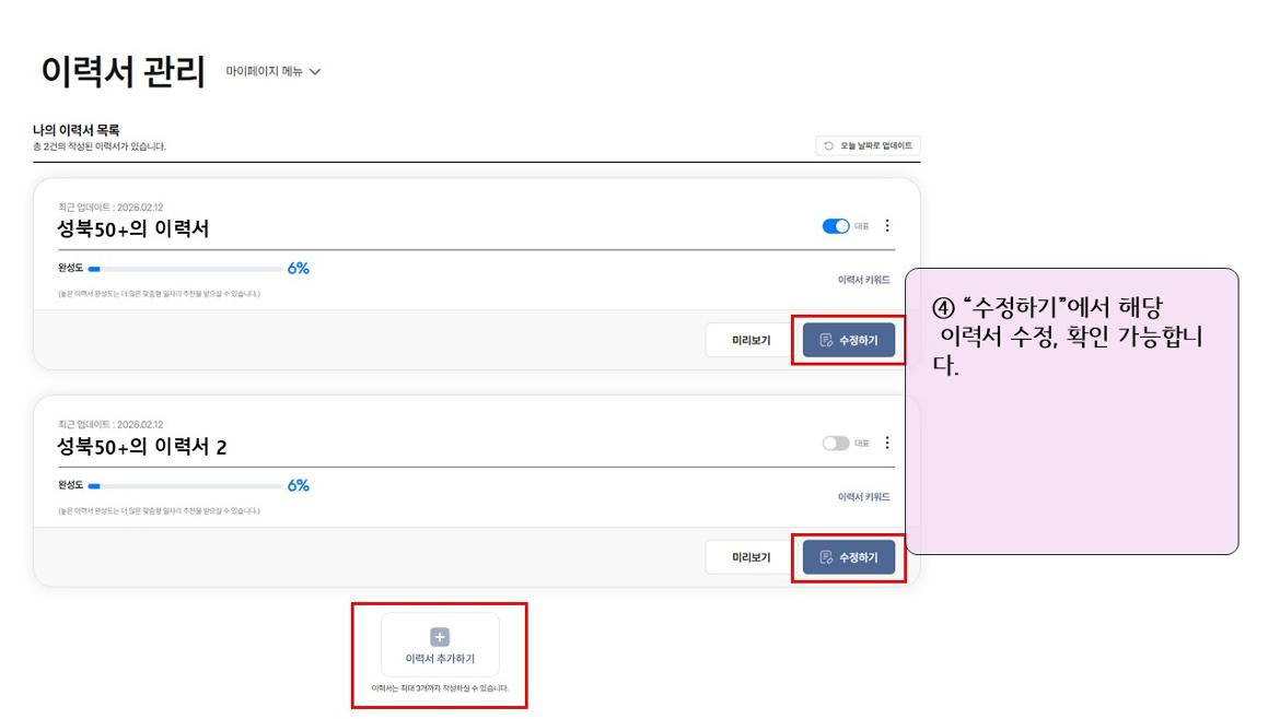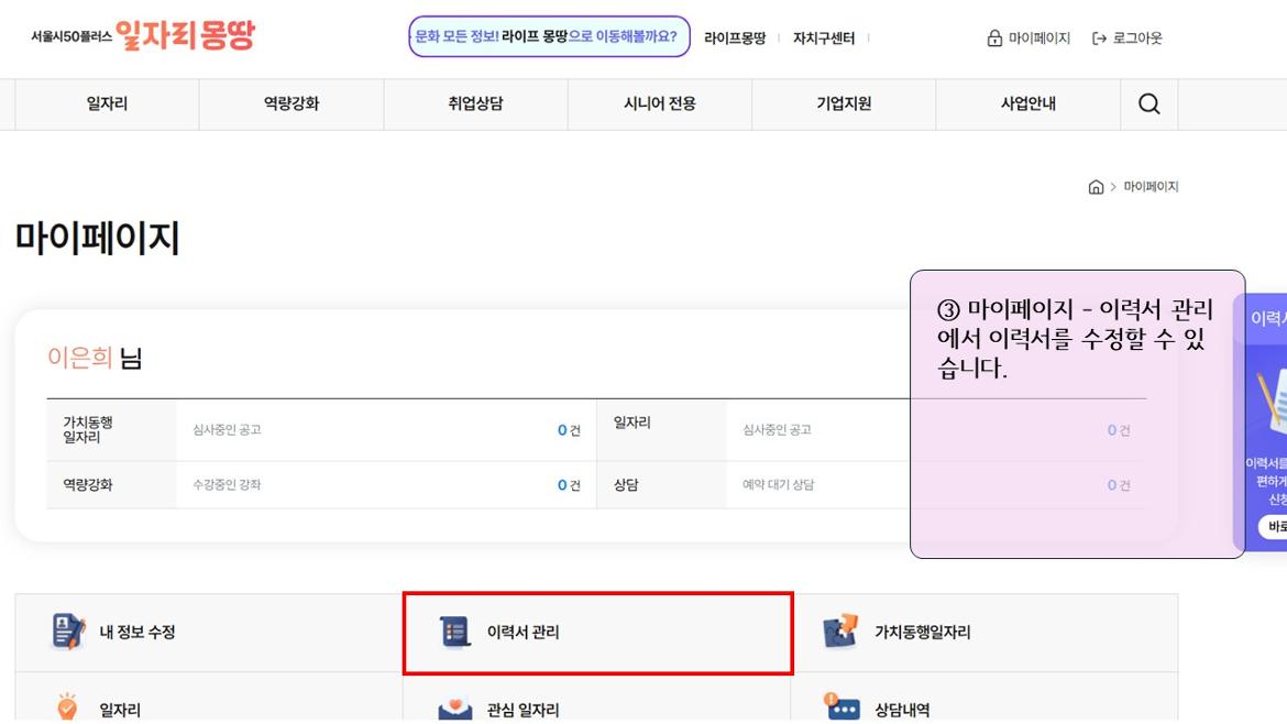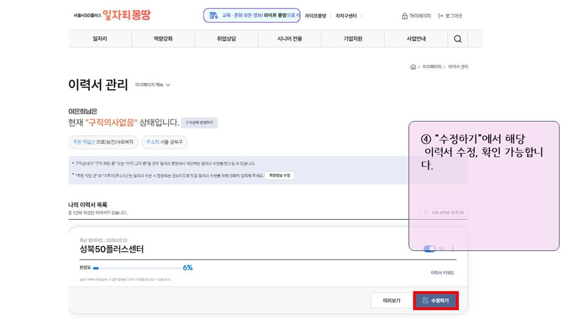 서울50플러스재단 홈페이지 개편에 따라 가치동행일자리 성북지역복지사업단 이력서 작성법을 안내 합니다.