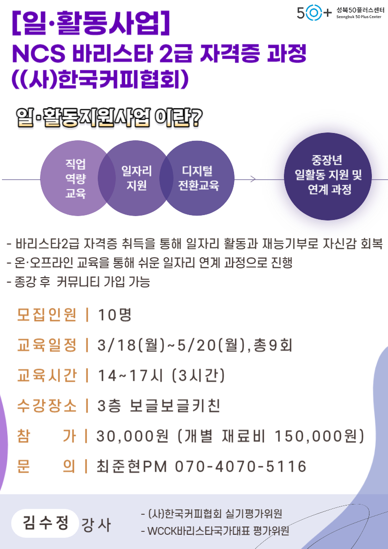 [서울런 4050 일·활동사업] NCS 바리스타2급 자격증 과정 ((사)한국커피협회)