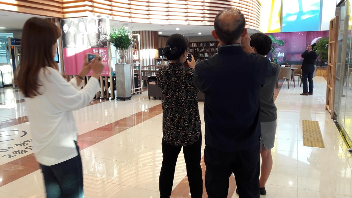 직접 찍어 보는 실습으로 중부캠퍼스를 짧게 소개하는 영상촬영이다. “숨은 곳도 찍어보고 다양하게 앵글을 쓸 수 있는 지 사진이 아닌 영상촬영으로만 하라”는 주문에 교실 밖으로 나온 수강생들은 스마트폰으로 찍기 시작했다.
