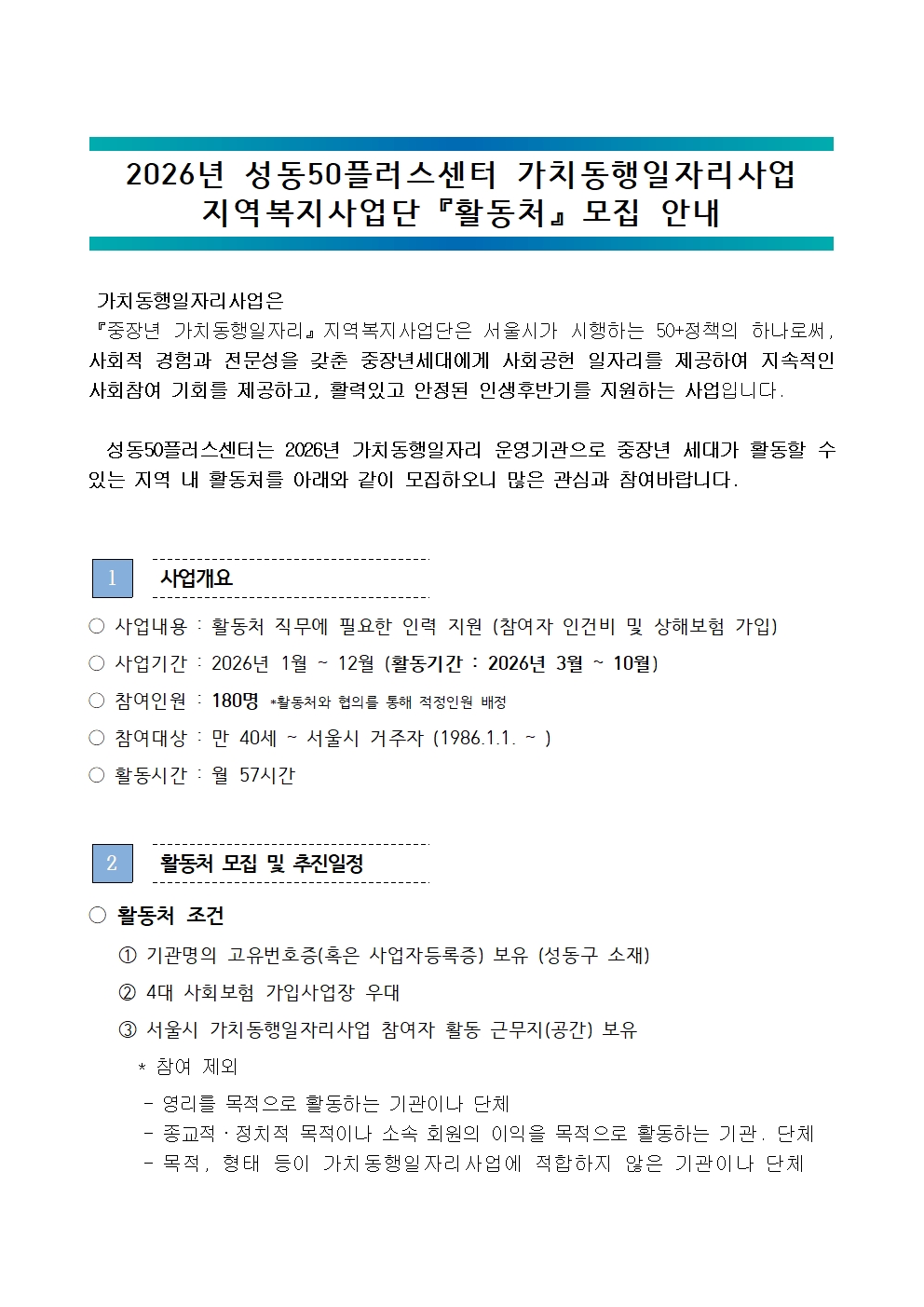 서울시 성동센터 | 2026년 성동50플러스센터 가치동행일자리사업 지역복지사업단 [활동처] 모집