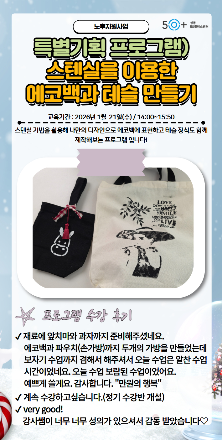 서울시 성동센터 | [1월 프로그램 수강후기] 특별기획프로그램) 스텐실을 이용한 에코백과 테슬 만들기