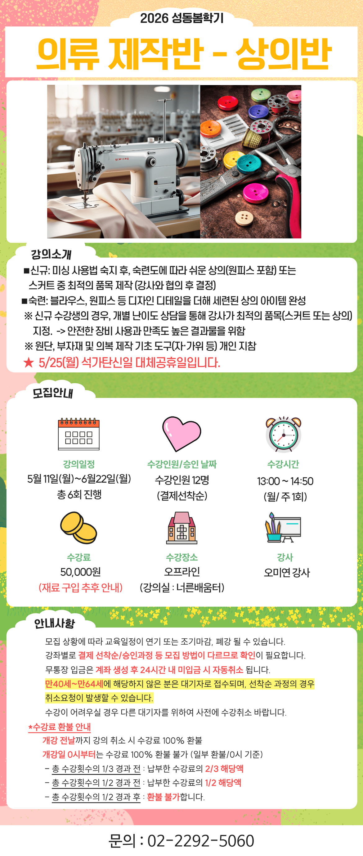 (5 회차) 2026.06.15(13:00 ~ 15:00) 너른배움터 오미연 [공통] 세부 디테일 봉제 및 중간 점검 원단, 부자재, 기초 봉제 도구(자, 가위 등)