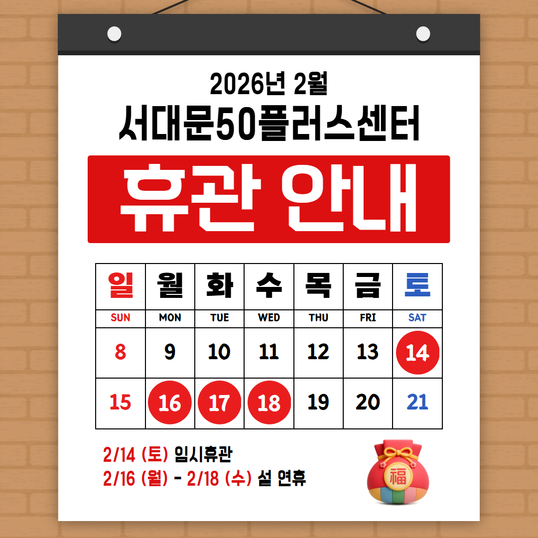 설연휴인 [2월 16일 (월) - 2월 18일 (수)] 기간 동안 센터 휴관합니다.