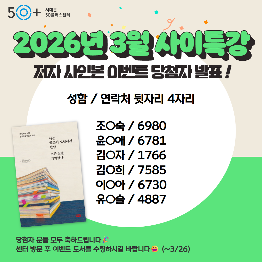 당첨자 분들은 3월 26일 (목)까지 센터 방문 후 이벤트 도서를 수령해주세요!
