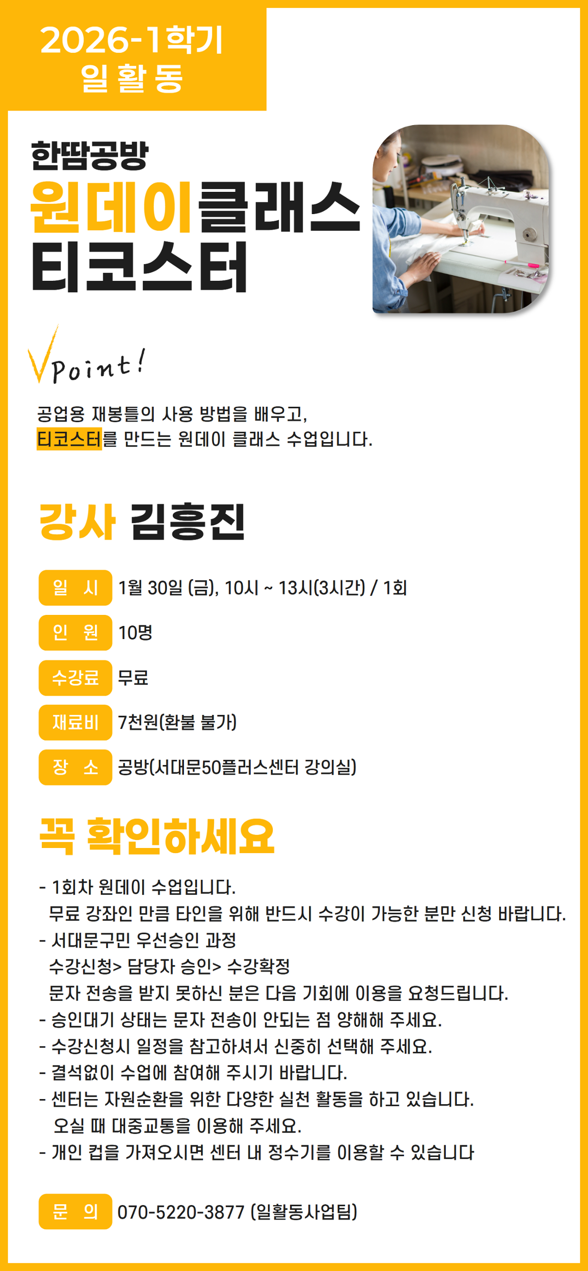 (1 회차) 2026.01.30(10:00 ~ 13:00) 한땀 공방 (전체 대관) 김흥진 [티코스터]
