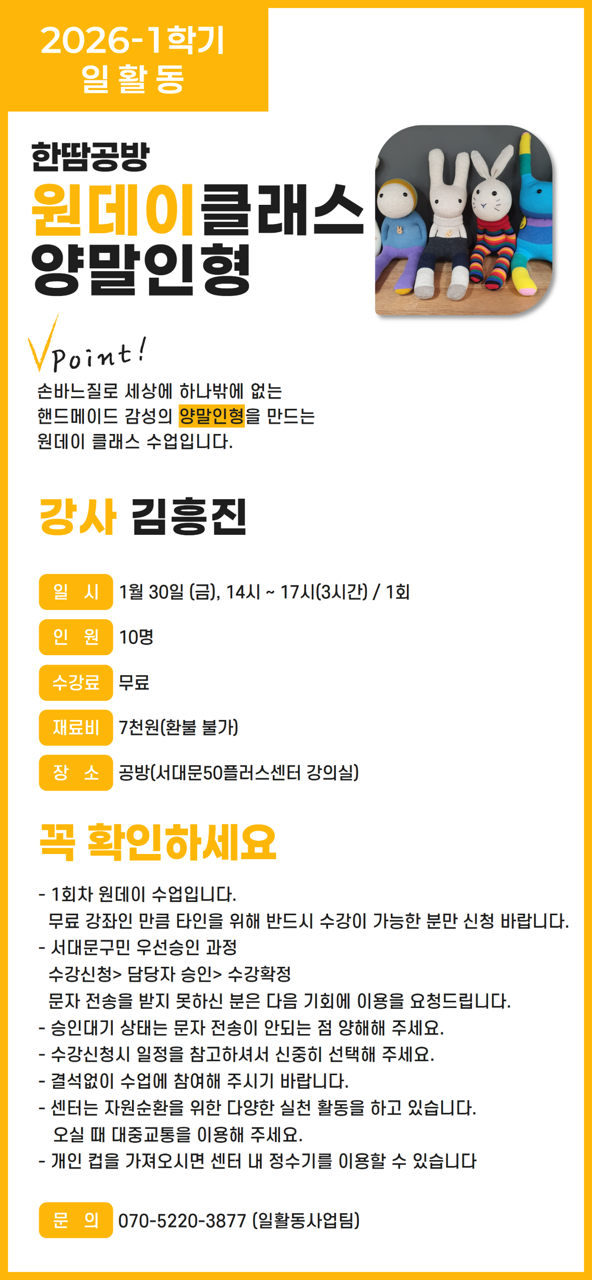 (1 회차) 2026.01.30(14:00 ~ 17:00) 한땀 공방 (전체 대관) 김흥진 [양말인형]