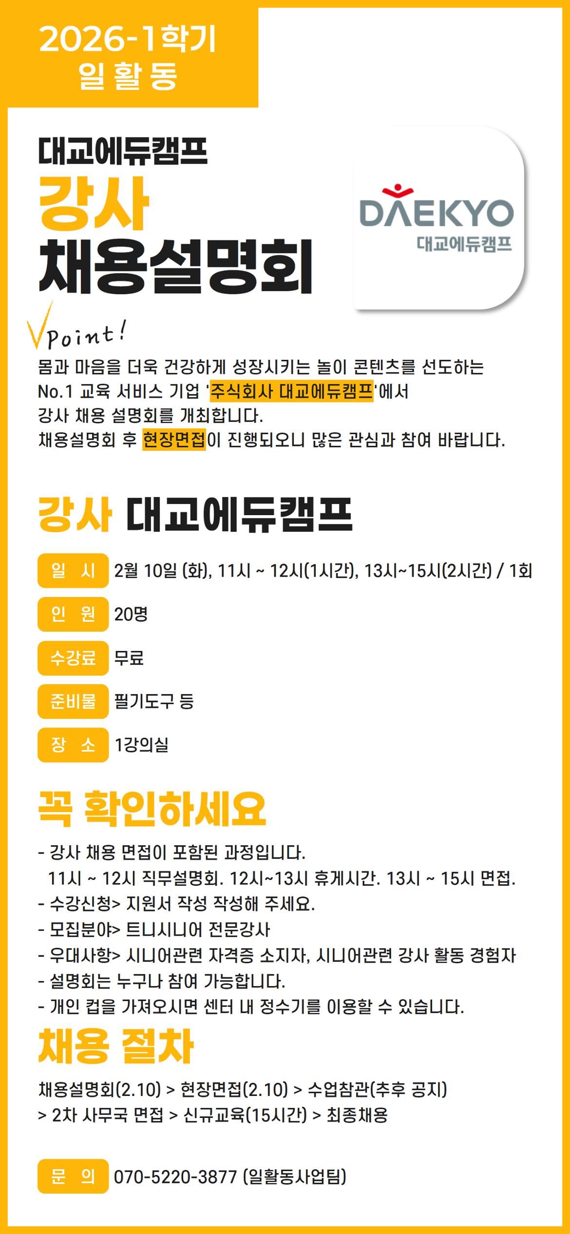 (1 회차) 2026.02.10(11:00 ~ 15:00) 강의실1 (주)대교 교육팀 대교 에듀캠프 _ 트니시니어 부분 전문강사 직무설명회