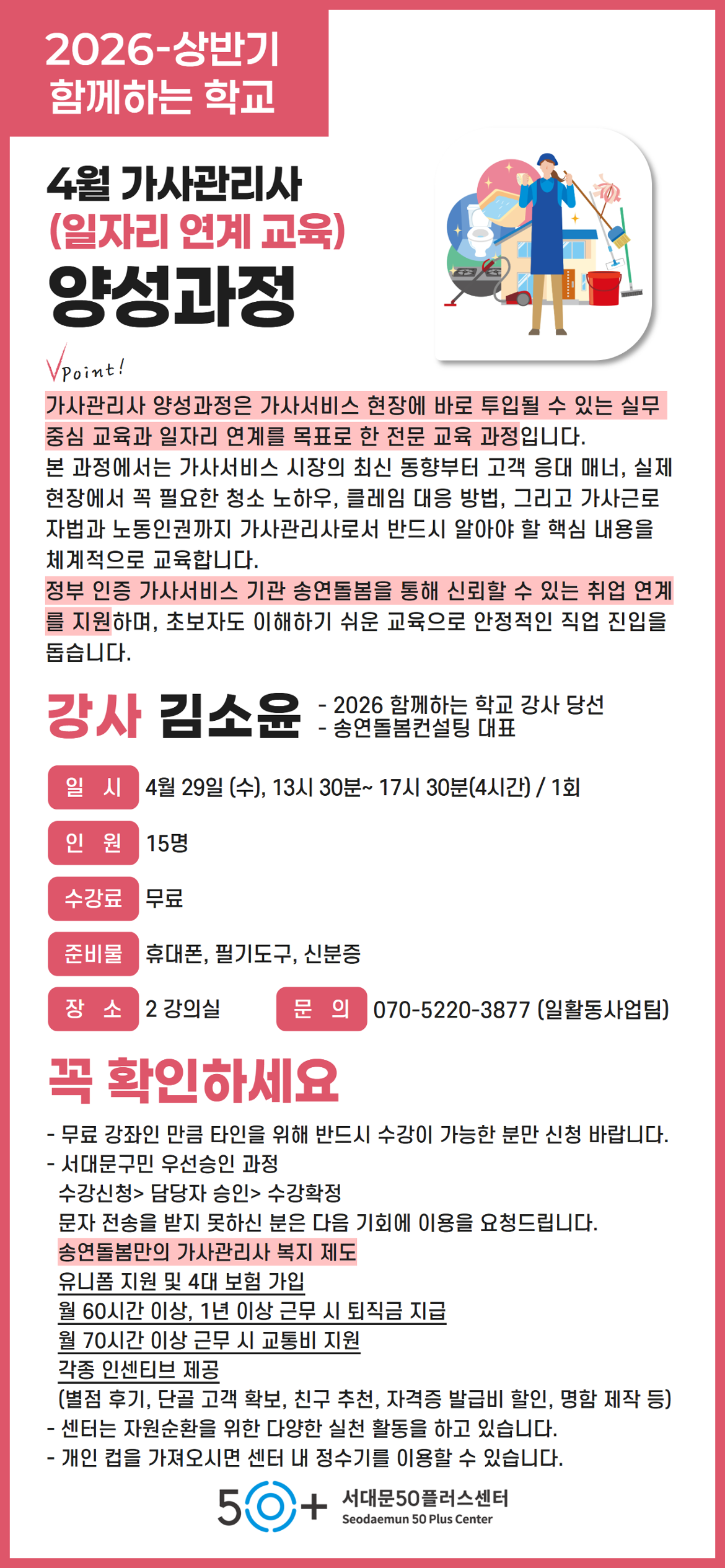 [함께하는 학교]4월 가사관리사(일자리 연계 교육) 양성과정