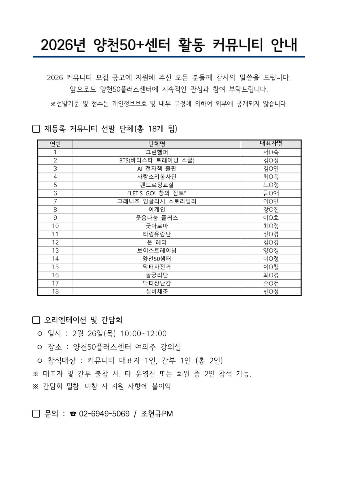 2026년 양천50플러스센터 활동 커뮤니티 안내