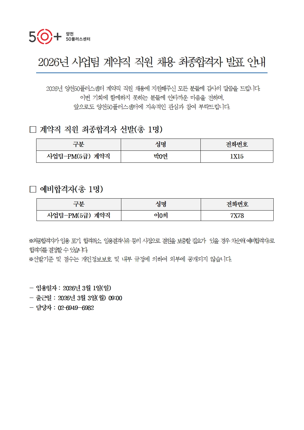 양천50플러스센터 계약직 직원 채용 최종합격자 발표 안내