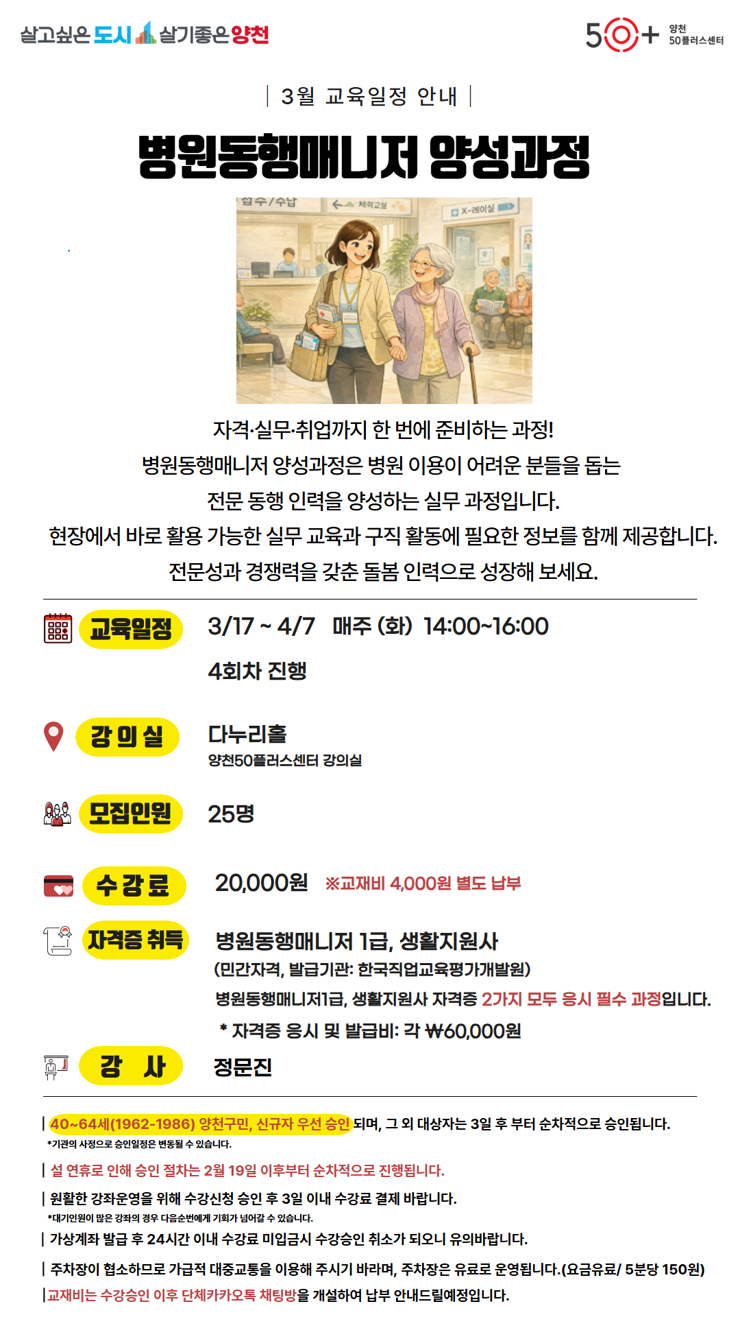 교재비(4,000원) 및 자격증 발급비(병원동행매니저1급 60,000원, 생활지원사 60,000원) 별도